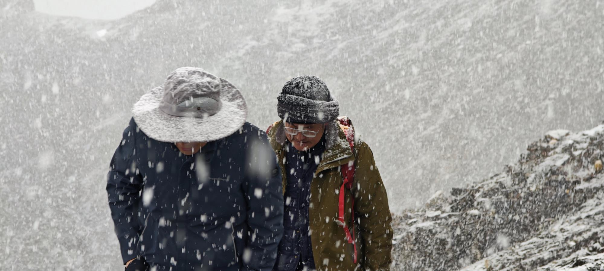 風雪是自然最凌厲的筆觸,把地質人塑成移動的“雪人”。濃霧彌漫處,巖石的棱角在能見度不足五米的混沌里隨時成了可能傾覆的陷阱。那頂被積雪壓彎的寬檐帽,在雪粒中仍緊盯著巖石的眼鏡,雪窩里深深淺淺不一的足印——每一步都是對“艱辛”專業和意志的考驗。在海拔3600米的碎石坡上,地質錘的敲擊聲被狂風撕碎,卻從未停下節奏;在零下十幾度的嚴寒里,凍僵的手指仍牢牢攥著羅盤,只為勾勒出地層最真實的褶皺。