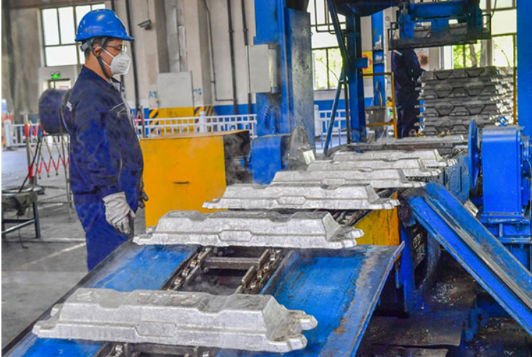 榆林新材料集團鑄造車間鑄造工正在查看鋁錠表觀質量