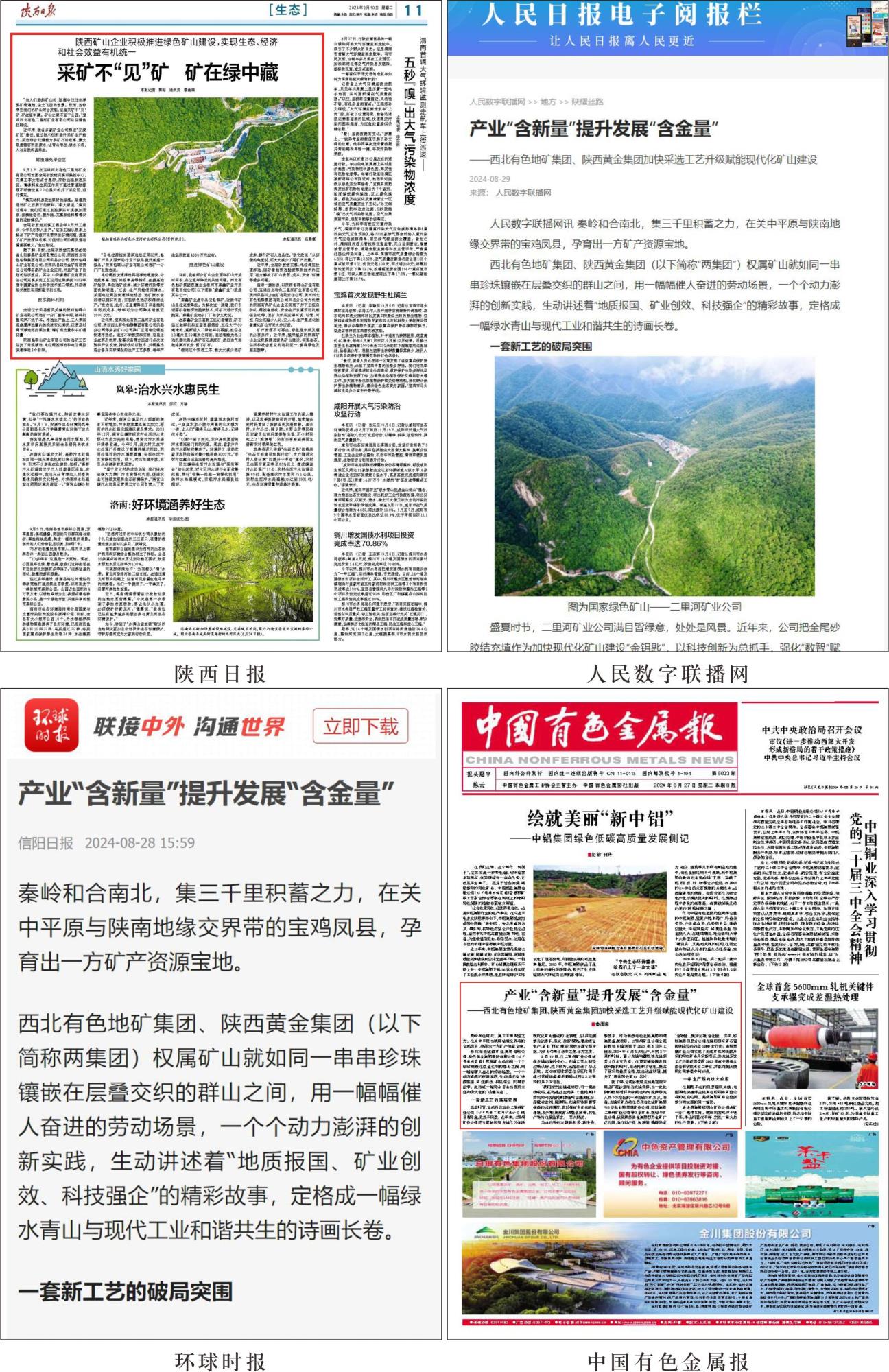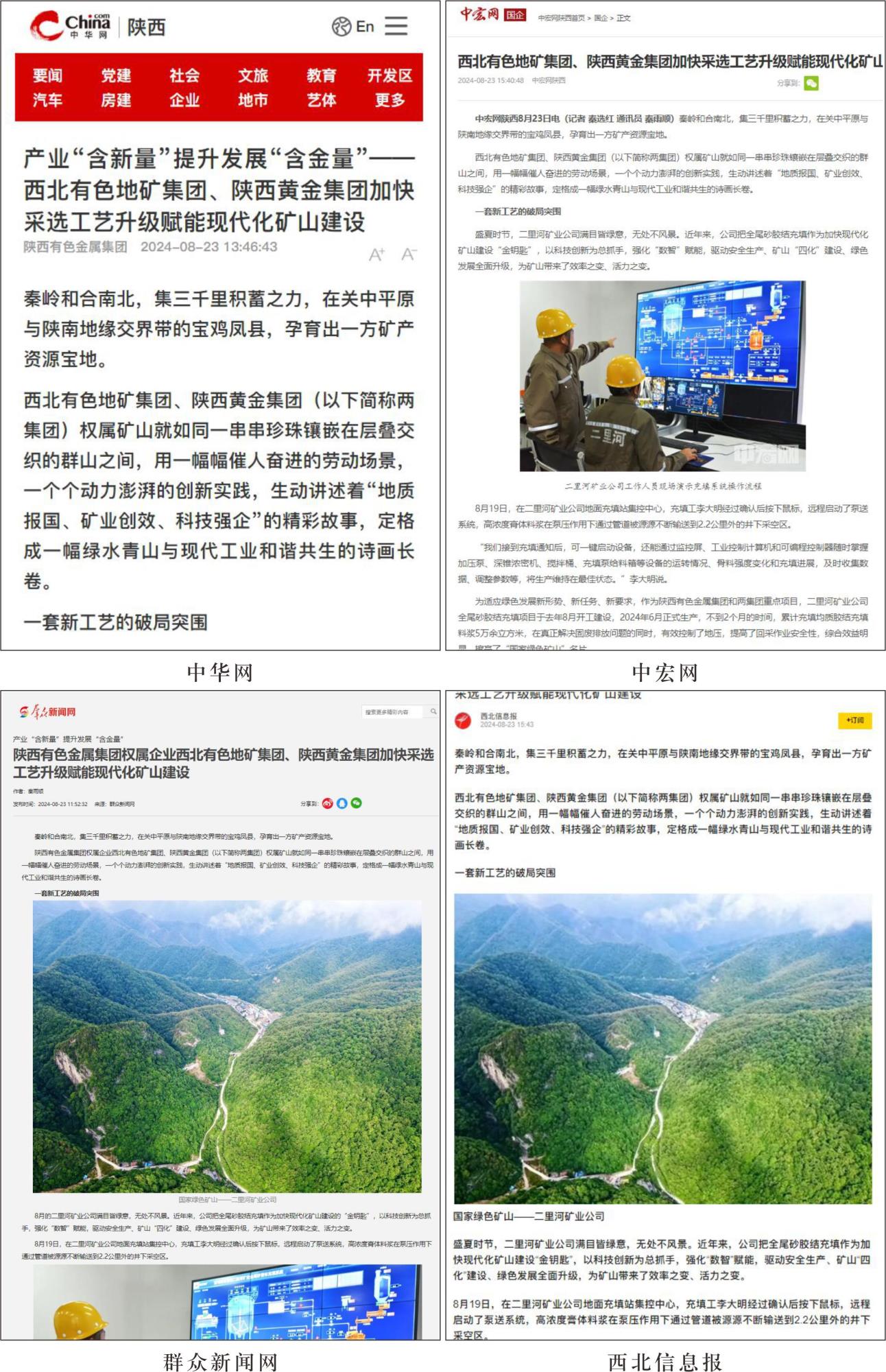 近日,人民數字聯播網、環球時報、中華網、中宏網、陜西日報、群眾新聞網、中國有色金屬報、西北信息報、各界導報等十余家中、省主流媒體,分別以《產業“含新量”提升發展“含金量”——西北有色地礦集團、陜西黃金集團加快采選工藝升級賦能現代化礦山建設》《陜西礦山企業積極推進綠色礦山建設,實現生態、經濟和社會效益有機統一——采礦不“見”礦 礦在綠中藏》為題,紛紛聚焦兩集團在統籌推進科技創新、產業創新,因地制宜加快采選工藝升級,賦能現代化礦山建設方面的新進展、新成效。