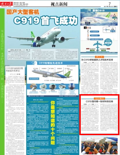 5月5日,國產商用大飛機C919成功首飛,寶鈦集團有限公司作為國產大飛機國內唯一鈦材料供應商,備受矚目。