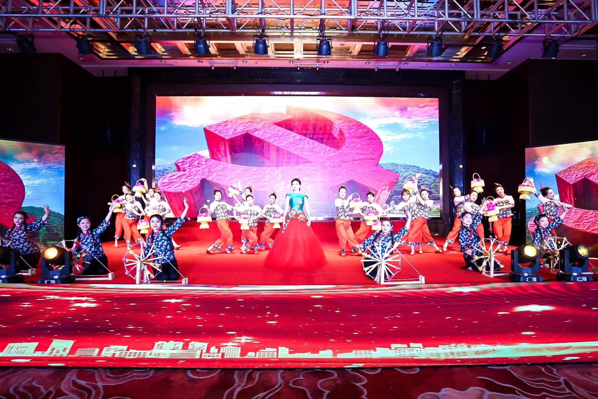演出現場,燈火輝煌。舞臺中央的LED大屏幕上,金色的黨徽熠熠生輝,中國共產黨成立100周年慶祝活動標識亮麗奪目。紅色背景在璀璨的水晶燈的照射下,給金燦燦的天花板鍍上一層鮮紅,宛如早晨天邊初生的朝霞,充滿希望。慷慨激昂的暖場音樂,營造出和諧向上的良好氛圍。