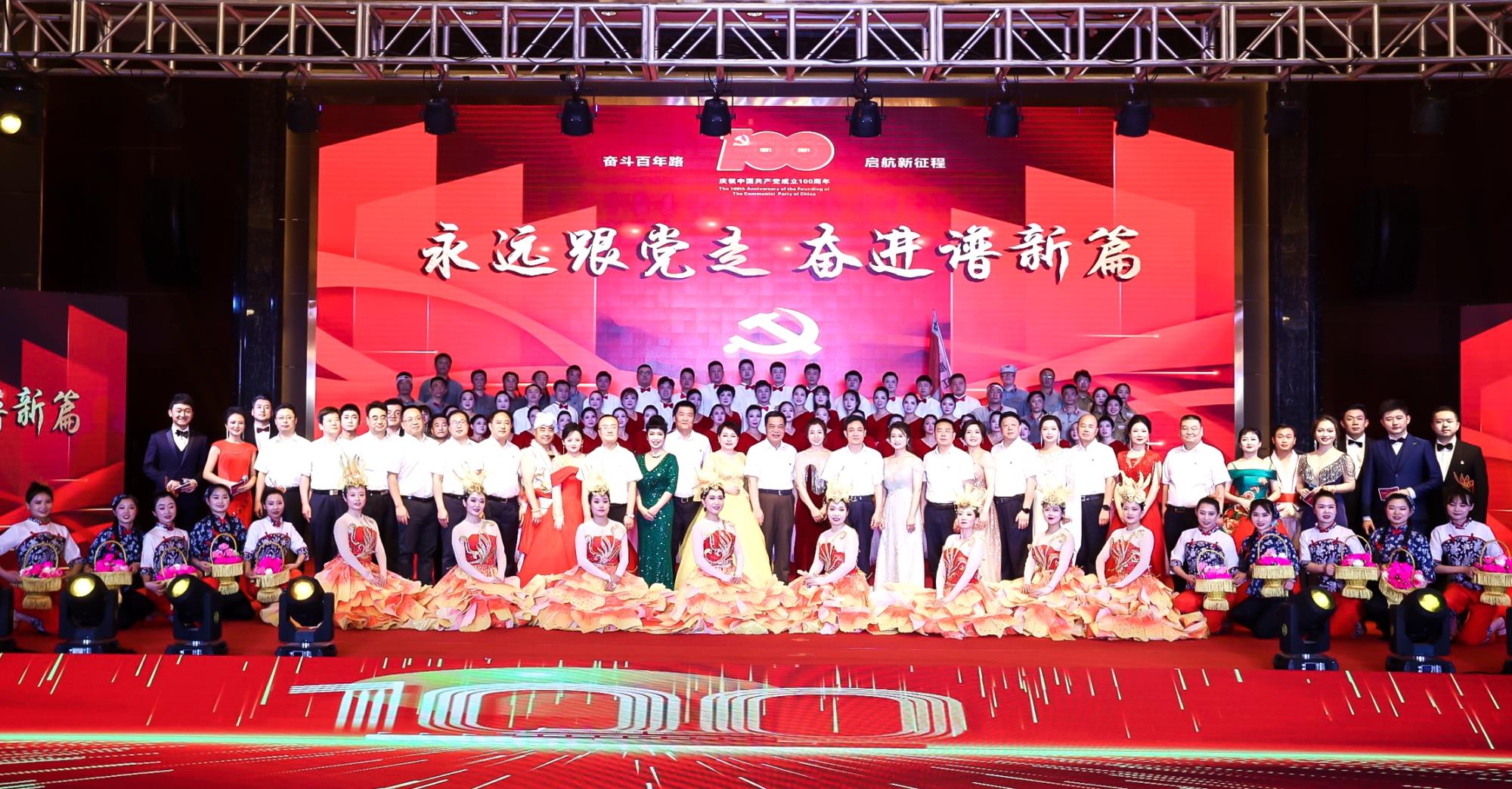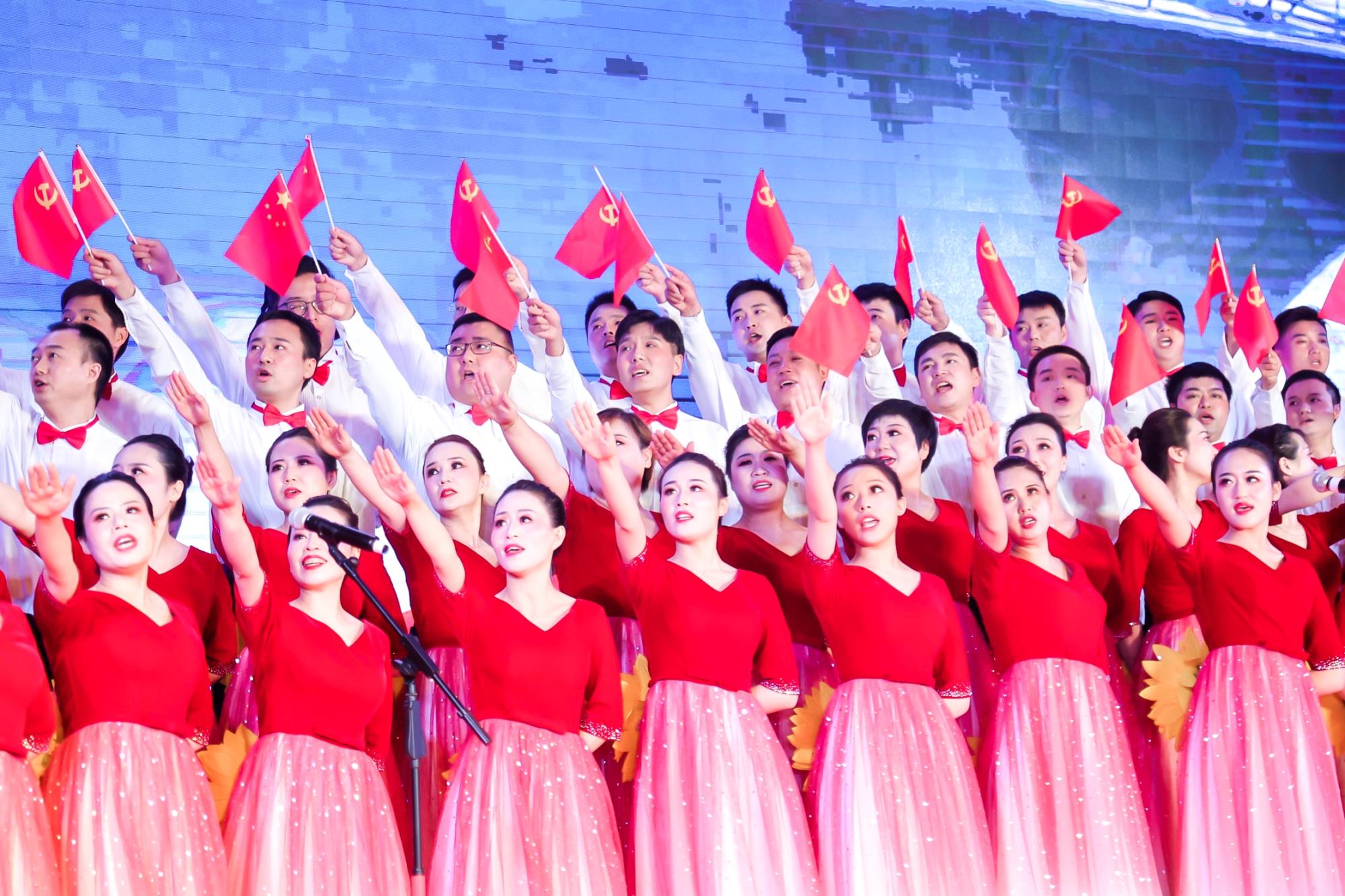 演出最后,全體起立,齊唱歌曲《沒有共產黨就沒有新中國》。大家激動地揮舞著手中的旗幟,臉上洋溢著幸福的笑容,共同為中國共產黨成立100周年華誕獻上深情的祝福。