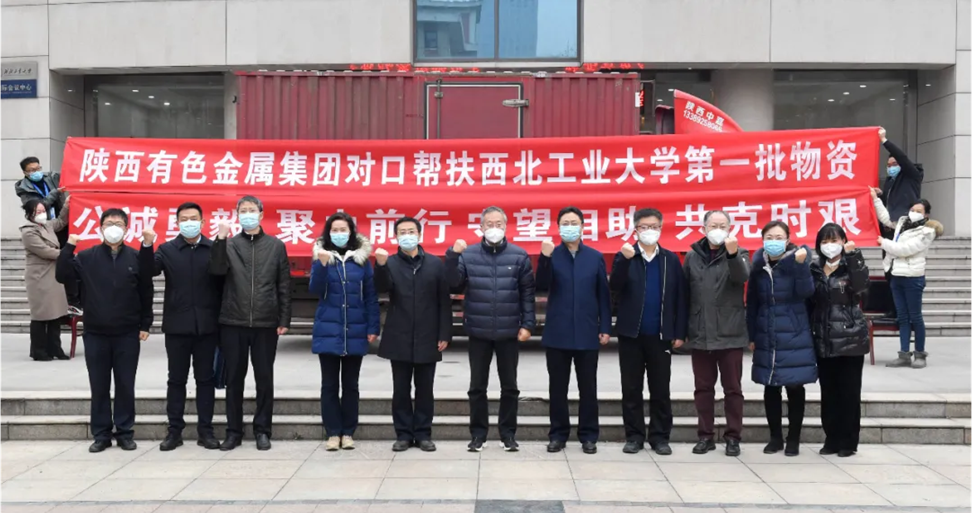 1月4日下午,陜西有色金屬集團黨委副書記郭仕龍、副總經理吳群英帶隊,將價值32萬元的第一批捐贈物資運送至西北工業大學。據悉,本次支援西北工業大學的物資包括:新鮮蔬菜10263斤、雞蛋10047斤、豬肉11151斤、防疫用品10000件等。第二批捐贈物資正在加緊籌措運輸中,將于近期運抵學校。