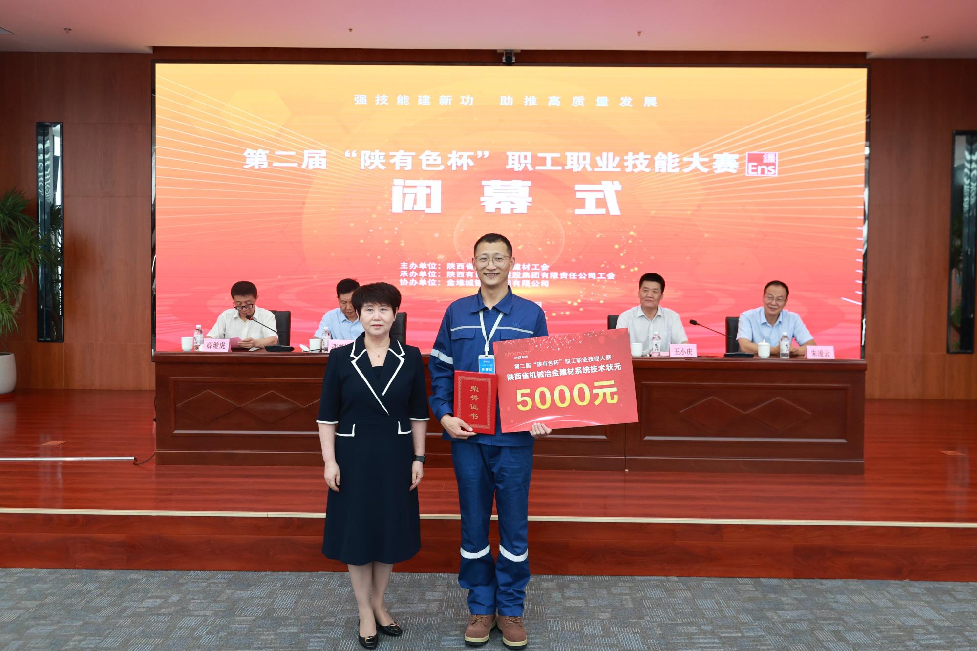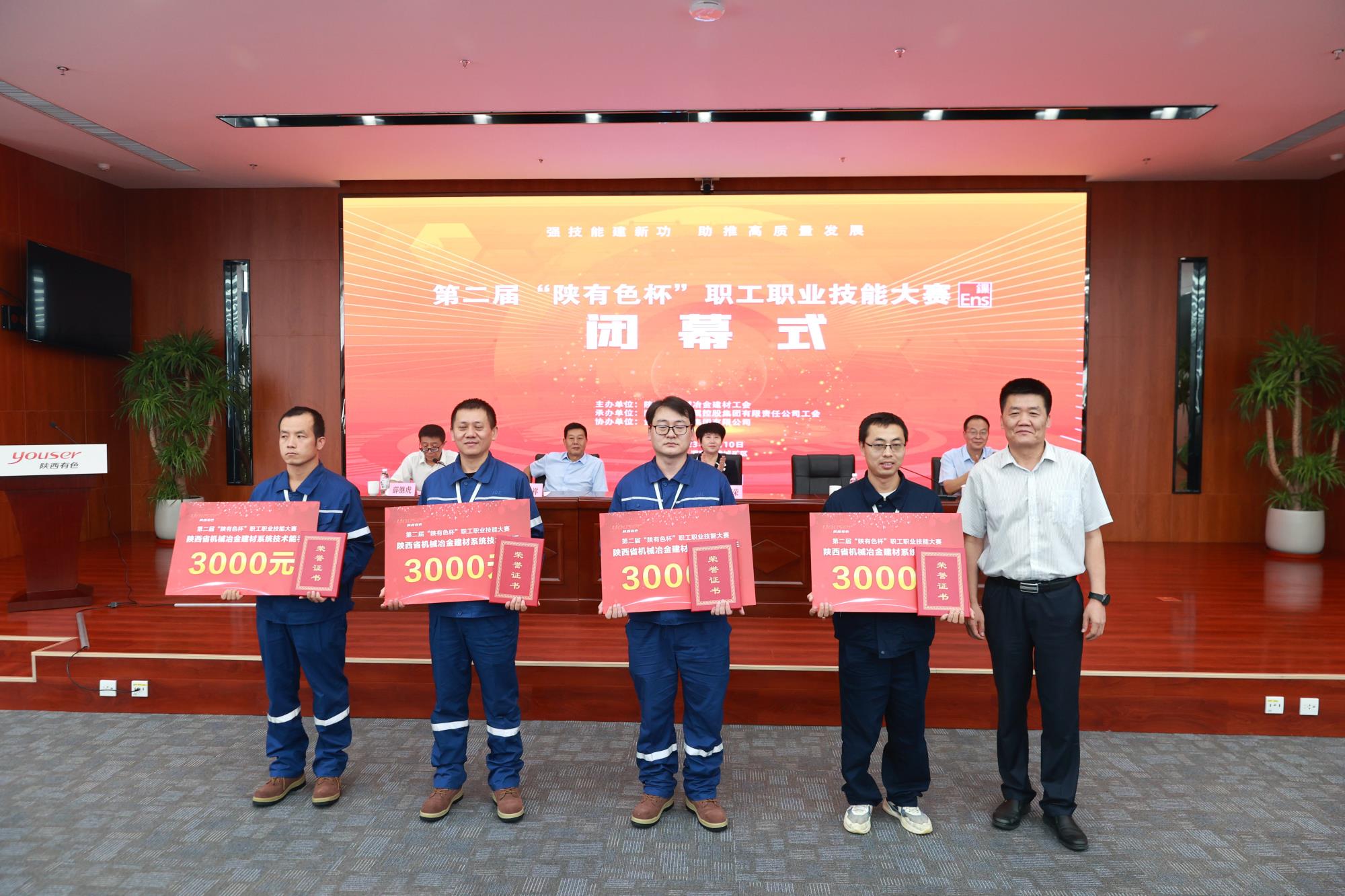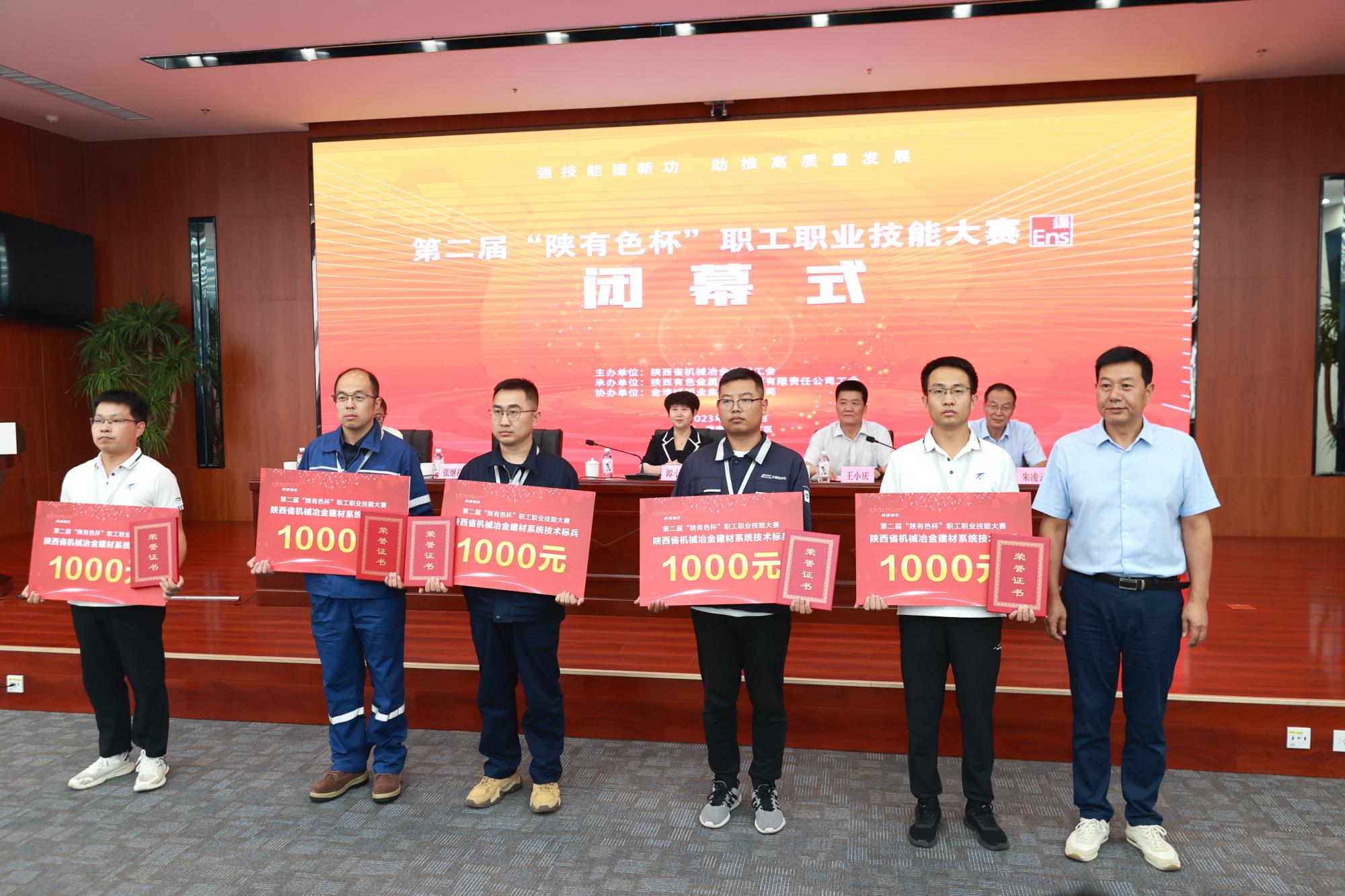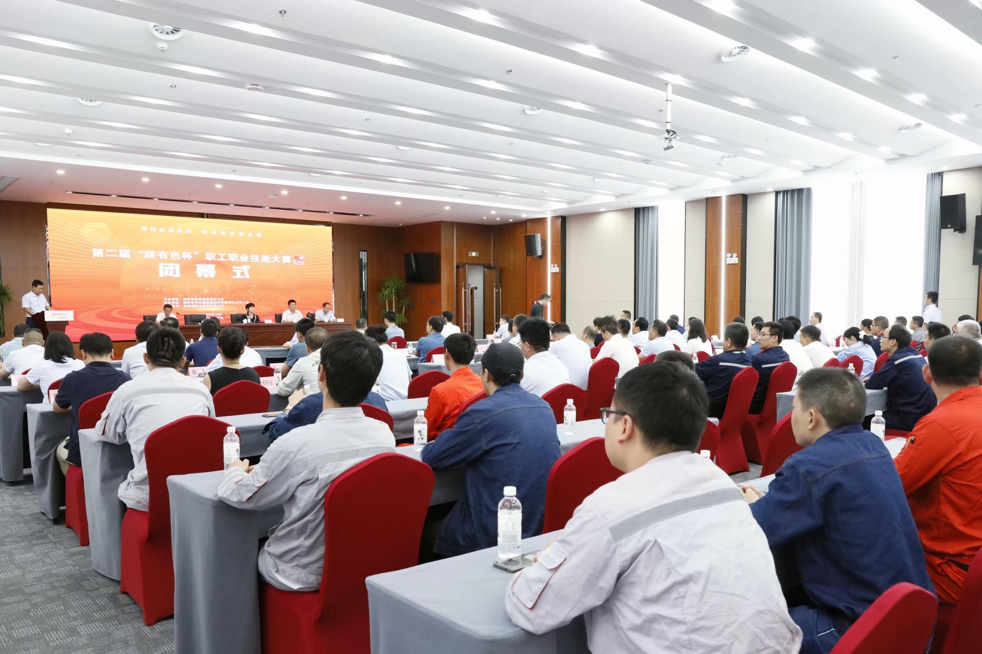 省機械冶金建材工會主席譚小榮,陜西有色金屬集團黨委副書記、董事、工會主席王小慶,工會常務副主席張繼祥,人力資源培訓部經理、大賽總裁判長王學慶,金鉬集團黨委副書記朱凌云出席閉幕式。省機械冶金建材工會二級調研員薛繼虎主持閉幕式,并宣布第二屆“陜有色杯”職工職業技能大賽閉幕!