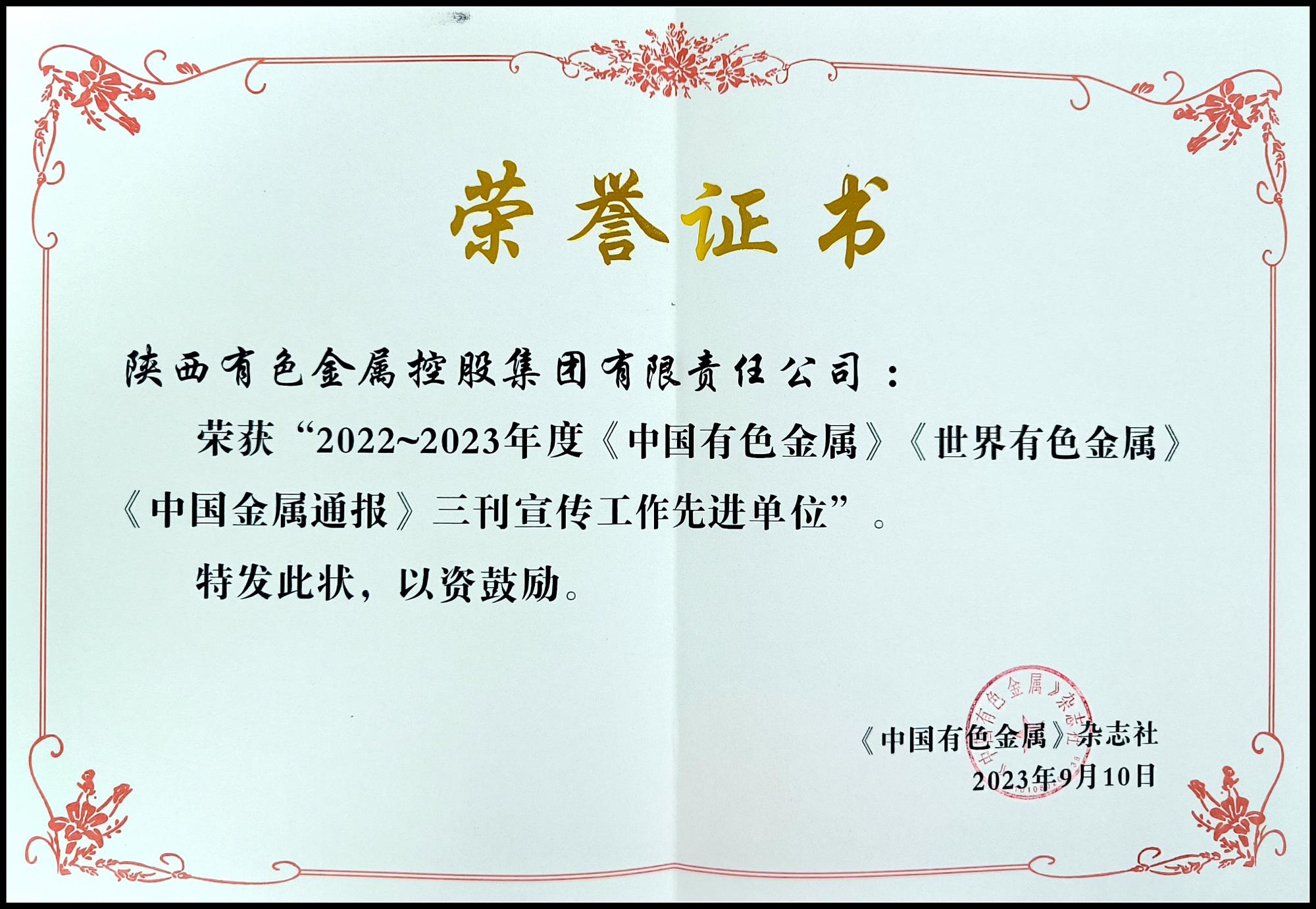 9月21日至22日,2023年《中國有色金屬》《世界有色金屬》《中國金屬通報(bào)》三刊特約通訊員、《中國有色金屬工業(yè)年鑒》撰稿人工作會(huì)在烏魯木齊市召開。會(huì)議表彰了2022—2023年度宣傳工作先進(jìn)單位,陜西有色金屬集團(tuán)被《中國有色金屬》雜志社評(píng)為“宣傳工作先進(jìn)單位”。