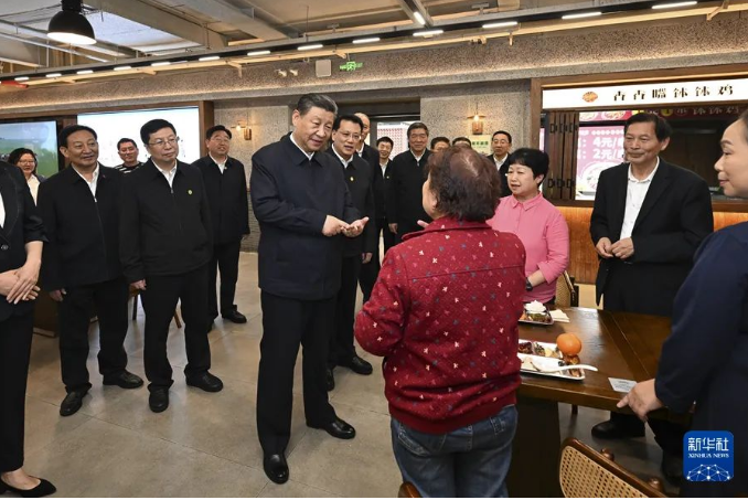4月22日至24日,中共中央總書記、國家主席、中央軍委主席習近平在重慶考察。這是22日下午,習近平在九龍坡區(qū)謝家灣街道民主村社區(qū)考察時,同正在社區(qū)食堂就餐的群眾親切交流。