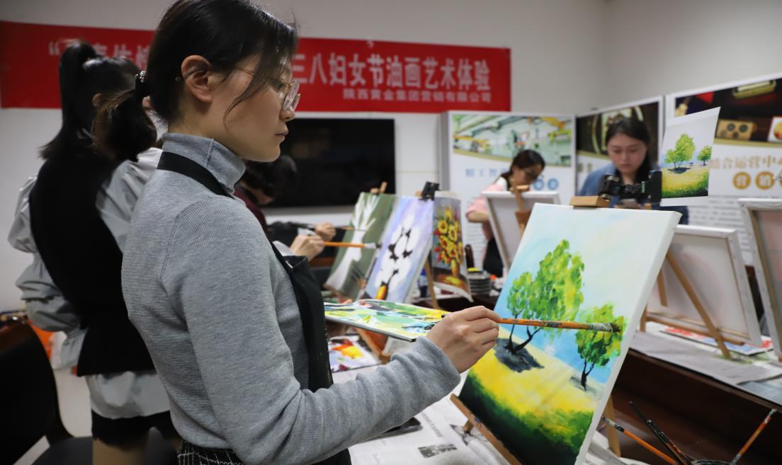 黃金營銷公司 營銷公司工會組織女職工開展“丹青傳情·歡樂共享”三八婦女節油畫藝術體驗活動。大家在油畫老師的指導下進行零基礎學習。活動氣氛熱烈,調顏料、打線稿,大家互相欣賞、拍照留念。